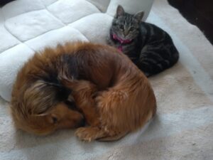 あれほど弱りきっていたモモが、いまでは他の猫や犬と走り回り、遊び、甘え、以前と変わらない姿を見せてくれるようになりました。その姿を見るたびに、苦しそうに呼吸していた日々、痩せ細っていた背中を思い出し、「本当によく頑張ったね」と声をかけたくなります。治療はあと1か月、最後までしっかり見守りながら、この経験がFIPと向き合う方々の力や参考になればと願っています。
